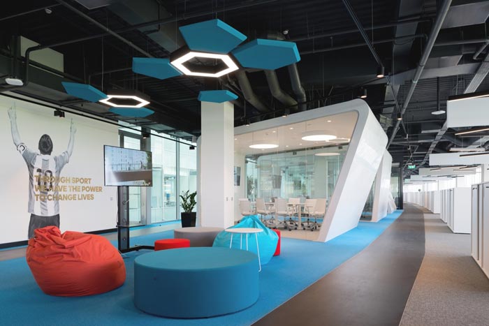 本次运动用品制造商厂家办公室装修设计案例讲解到此结束,设计师认为设计的样式千变万化,但是前提就是不能脱离实际,脱离实际的设计如鱼儿离开了水不会长久。