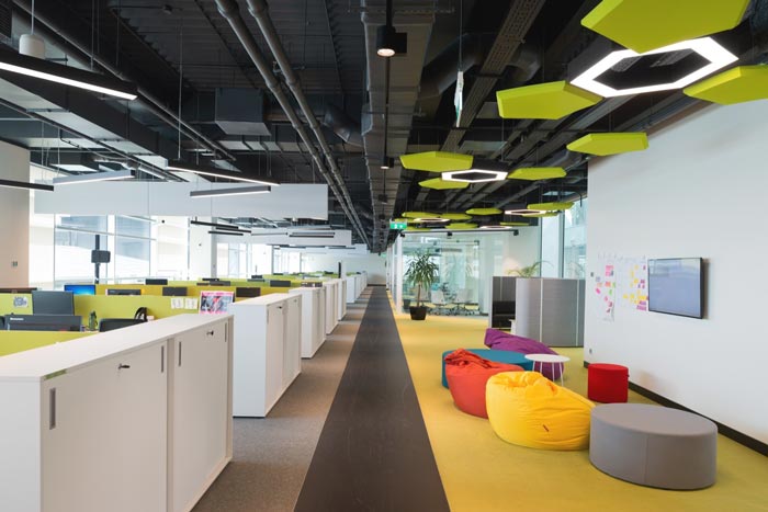 办公区域的设计:设计师在设计的时候,将办公空间采用开放式的设计手法,在设计师看来开放式有其不可替代的优势,在设计的同时设计师又利用办公桌+隔断将其分离成一个小小的空间,在开放的同时为员工预留足够的私人空间,将开放式空间的优势发挥到极致。