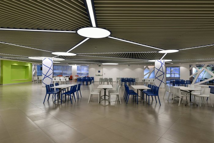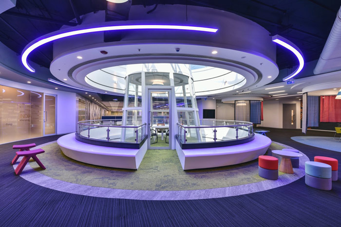 厂房办公室办公区休息区设计:整个办公空间按照一个圆形分布,阳光透过上部圆形的造型四面射入空间,将照入室内的阳光最大化,同时此处也给人很强的科技感,好似宇宙飞船降落的那一瞬间。