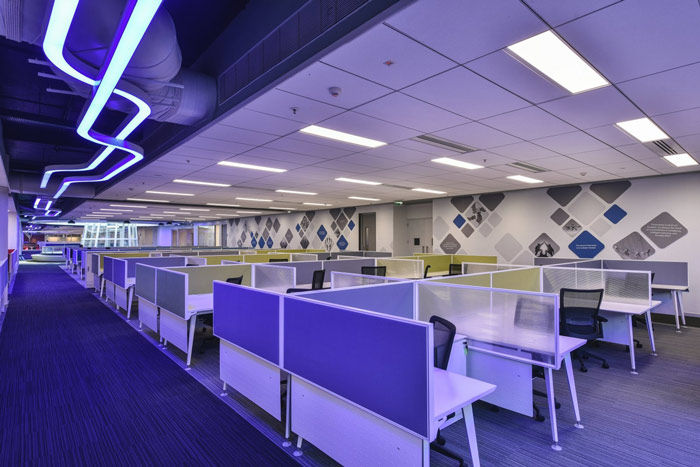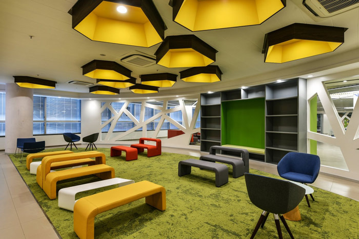 厂房办公室办公区设计:办公桌采用开放式加私人两种模式相结合的模式,当员工站起来之后整个空间是连接在一起的,当员工坐下之后整个空间瞬间分割成一个个的小格子,在办公与空间之间达到平衡。