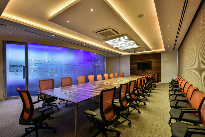 厂房办公室大会议室设计:整体看此处是一个不规则的空间,而设计师恰恰就是要利用这样的不规则,将大会议室完全暴露在开放的空间之中,这样的目的就是为了突出打破二字,让员工可以不安套路出牌,让想法可以得到多方位的发展。
