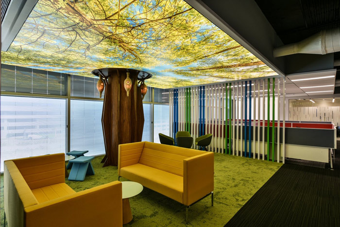 厂房办公室洽谈区设计:此处设计师人为的创造出一片绿意盎然的环境,目的就是希望让空间拥有绿色,相信在这样的空间中洽谈,对于双方都是一个不错的选择,美好的环境拉近双方的距离。