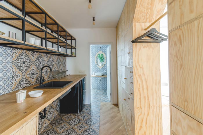 茶水间的设计:此处位于一个独立的空间之中,设计师在设计中借用了厨房的设计模式,咋一看就是一个厨房,但是仔细观察后会发现,设计师将整个空间开发到极致,茶水台上方的放置台、后方的储藏柜、储藏柜中间的内置衣架,从储藏到收纳应有尽有,可以感受到设计师对于生活的态度。