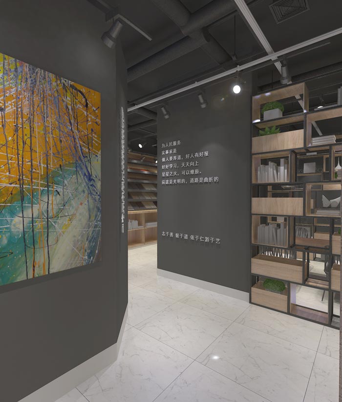 会议室的设计:此处位于两个展示隔断的中间区域,这也是唯一一个可以利用的空间,由于空间面积有限所有多元化的设计就十分必要,隔断对外可以阻隔实现,对内可以起到墙体的作用,同时也不会对整个空间造成影响,反而对空间形成了一个互补的格局。