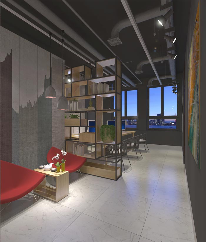 接待区域的设计:此处安置与进门区域与办公区域之间的过渡空间,因为空间的面积本身就十分有限,故此软装的搭配也需要相应的斟酌,而且在设计师眼中此次设计不在多、在于精,也只有如此才能与整个空间相融,大有大的好处、小有小的魅力。