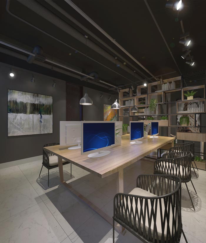 办公区域的设计:设计师对于此处有十分高的要求,因为此处是企业发展的动力所在,企业的发展在于人才,那么如何留住人才就是设计师需要考虑的问题,六人办公桌坐落在空间之中,设计师舍弃了所有的复杂设计,寻求的是一种简单的美,简单本身就是一种复杂到极致的美,这个哲学问题本身就对人有很大的启发性。