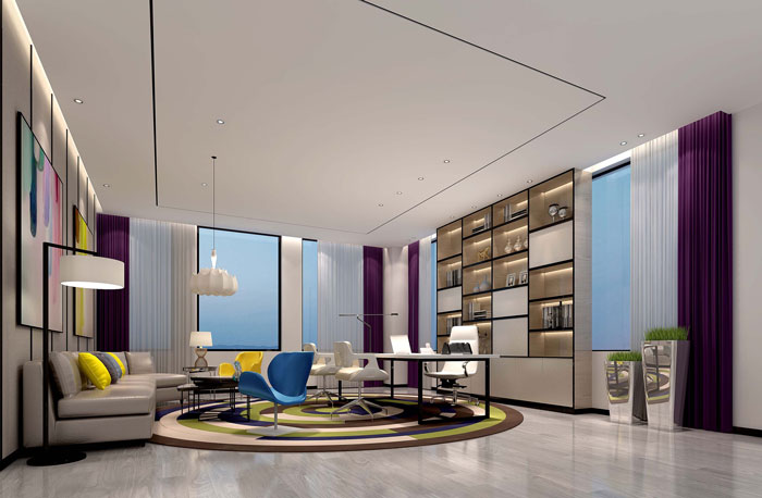 总经理办公室的设计,设计师将合的观点进一步提升,之前的区域只是空间上的合,现在的合却是一种色彩、硬装、软装之间的综合体现。