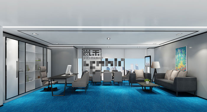 总经理办公室开敞明亮,落地玻璃窗带进满室灿烂的阳光,而在晚上,美丽的城市夜景则可尽收眼底。深棕色的原木桌椅,黑色沙发,灰色地毯,融合了现代简约主义理念,散发着清新原始美,满室盈满浓郁的简约情调。