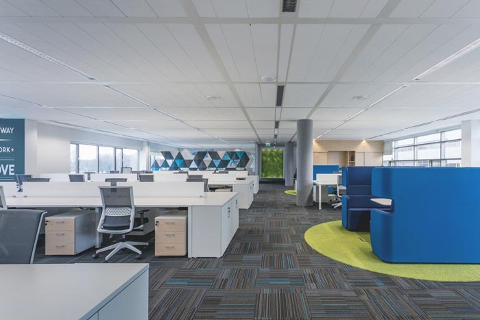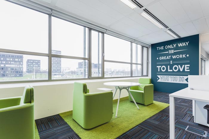 大办公室的设计:设计师在设计的时候,将其安置在一个大的开放空间之中,设计师采用取中的设计原则,在设计师看来取中可以将思绪全部集中在会议区域,同时地毯设计师采用了类似海洋的颜色,以此寓意企业顺风顺水,同时这样的设计将此处的向心力更加集中于中间部位,不会因为分散导致空间显得空旷。
