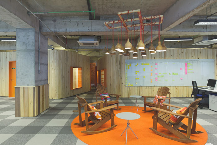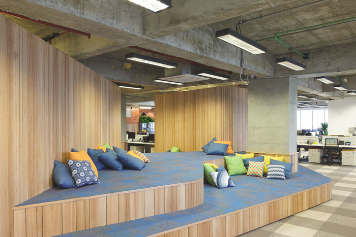 零售办公室休息区设计:设计师在设计的时候,考虑到企业员工众多,若是按照一般的休息区域进行设计,不但会造成空间的浪费、也无法满足全部的需求,设计师采用娱乐的设计原则进行设计,而且此地材质也是可替换的、可洗的,保证了空间的干净与洁净。