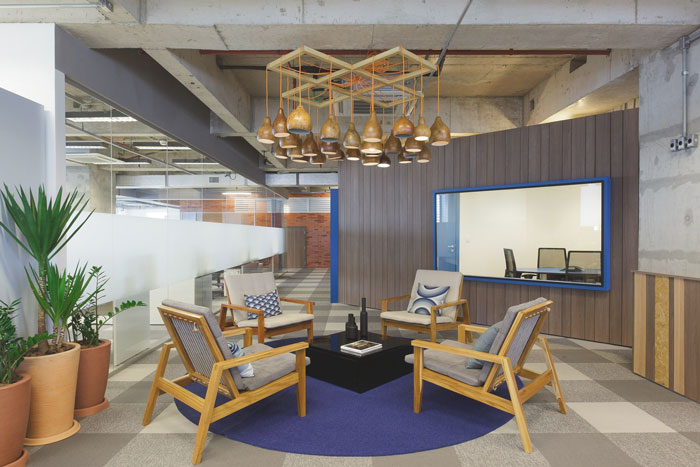 零售办公室办公交流区设计:设计师在设计的时候,将其安置在办公空间的边缘区域,在设计师看来这样的设计可以造成空间的多样性,让相互之前可以相互配套,企业与客户可在此地进行交流,促进相互之间的关系,另外员工与员工之间也可以在此地进行交流,此处彼此之间的关系。