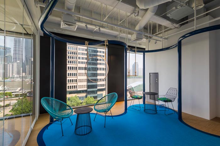 旅游公司办公室休息区设计:在这里可以俯视城市的众多美景,同时此处也是员工的休息区与办公区,企业没有特别规定员工一定要在办公区域办公,而是希望给他们相对的自由,让员工在这里找到家的感觉。