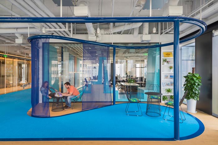 旅游公司办公室休息区设计:在设计中设计师却是另辟蹊径,以钢管做为造型材料,在设计中钢管高于头顶,但是却刚好在视线之内,这样在视觉上产生了阻隔的效果,但是实际上却不会起到任何阻隔。