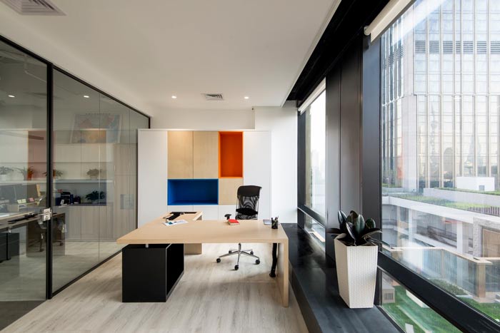 旅游公司总经理办公室设计:总经理办公室位于空间的一侧,在与总经理交流的时候,设计师了解到总经理本人喜欢简单一点,此地采光、风景、位置俱佳,即满足办公的需求,同时也满足休闲的需求。