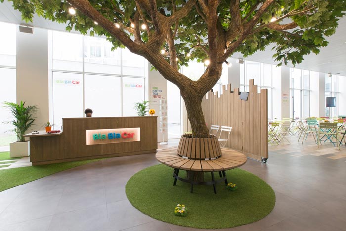 前台的设计:设计师以自然——树为设计的前提,将树移植在空间之中,设计师的想法就是以绿色来表现企业的服务,让客户进入后感觉到眼前一亮,但又不会感到突兀,在树根处以一圈圆形地毯、圆形座椅包围,让客户在树下休息可以感受到自然的气息,绿色的地毯在设计师的裁剪下形成一个动线的外围,形成了宛若天成的动线起到指引的作用。