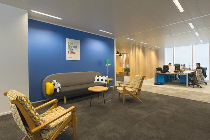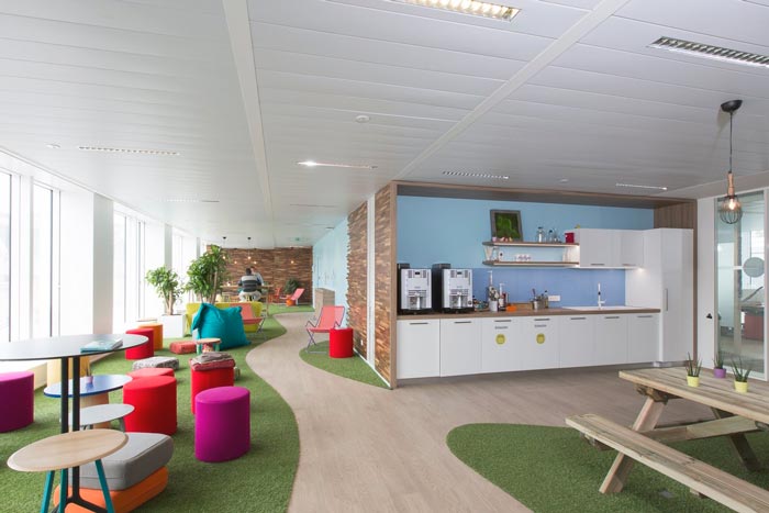 休息区域的设计:设计师在设计中参考了释放的理念,也是设计师的一种尝试,在设计师看来休息区域本来就是要为员工一个无压力的空间,故此设计师将设计完全删掉留下一个空空的空间,让空间有了更多的可能,将软装引入空间,让员工随自己的爱好进行摆设,也为员工营造了一个无拘无束的空间。