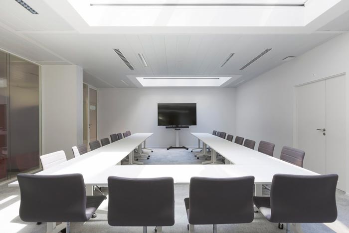 会议室的设计:此次的设计呈U字型排列,这样的设计既可以增加空间的承载能力,也为服务提高到一个新的高度,这样就涉及到哲学的问题,正所谓“实中有虚、虚中有实”,设计师将常规的实体变成一个虚体,让空间的格局有了巨大的变化,释放了更多的空间面积用于服务。
