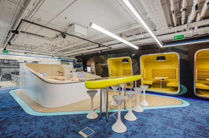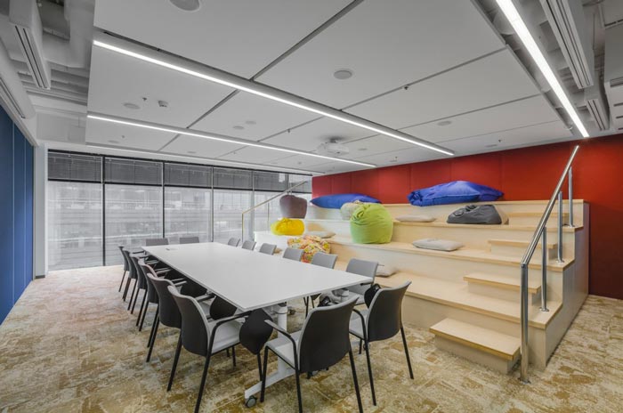 办公区域的设计:设计师在设计的时候,将办公区安置在空间的两侧,中间部分主要以洽谈、休息为主,同时在办公区域设置的同时,利用色彩的转变来区分部门的位置,每一个部门之间都有一定的缓冲地带,这样做的目的就是希望在开放的空间内保留员工的私人空间。