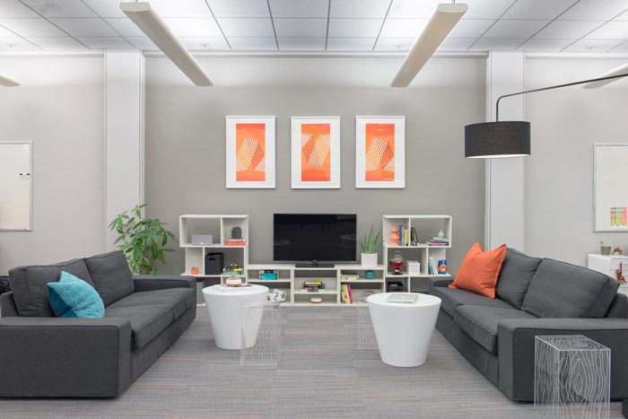 休息区域的设计:此次第一眼看起来更像是一个客厅,家的感觉是给人的第一感觉,设计的目的就是让员工感受到企业是一个大的家庭,让员工在此处感受到家的氛围,这样更能促进创意的产生,同时此处也可以做为交流区域,促进企业与客户之间的距离。