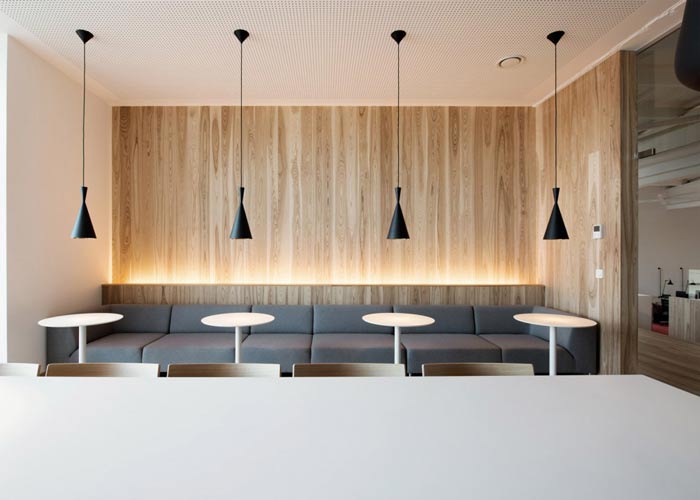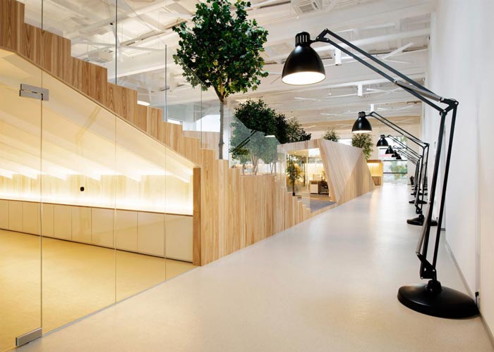 童装公司办公室休息区设计:此处乍一看更像是一个公园,这也是设计师希望看到的,室内公园为空间注入了新的活力,生生不息的活力注入空间,让人的疲惫心态一扫而光,清新的环境让人格外舒爽。