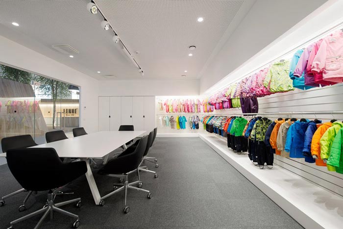 童装公司办公室会议室设计:设计师将会议室与展示区融合在一起,这样做的目的就是问题就在那里,摆在眼前解决,解决问题是会议开展的初衷,在这里任何问题都会被抽丝剥茧的解决掉,这也正是会议的神奇之处。