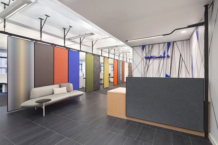 前台的设计:前台与办公区域位于空间的左右两侧,设计师在办公室设计中,将隔断打造成布匹的模样悬挂在空间的中心区域,这样一来客户进门后看到的就是一段段悬挂着的布匹,在显示企业属性的同时,也起到空间阻隔的作用,前台纵横加错的丝线仿佛是织布的线条,这无不在显示企业的属性。