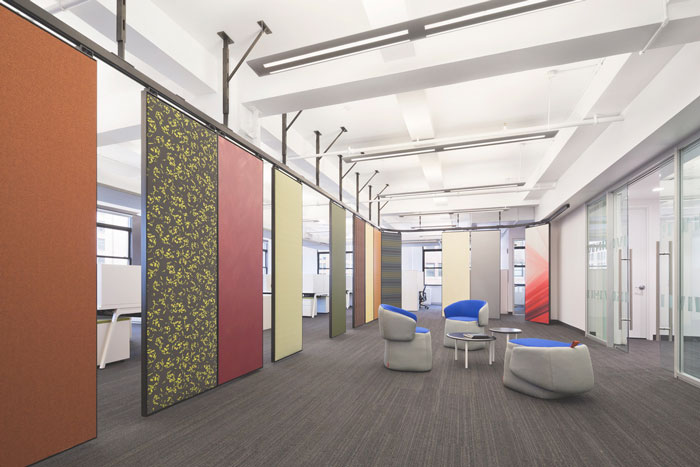 办公区域的设计:悬挂的隔断如一扇扇门将办公区域挡在视线之外,但悬挂的隔断不是死的而是灵活的,一扇扇可拉可合,开放的办公区加上半封闭的个人办公区,两者之间形成一个很好的结合,这样的设计旨在消除弊端,同时也在为企业营造利于发展的办公新格局。