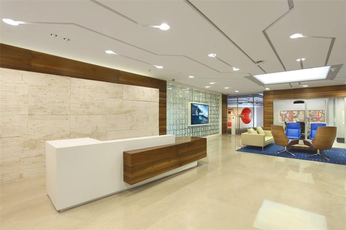 前台区域的设计:设计师在设计的时候,将前台空间划分为前台、接待、动线,在设计师看来前台以极简进行表现与设计,这样可以使客户在第一时间清晰了解企业的属性,同时接待区的设计以温馨、舒适为原则,在细节上体现企业以人文本的原则,动线将各个空间相互连通,起到桥梁的作用。
