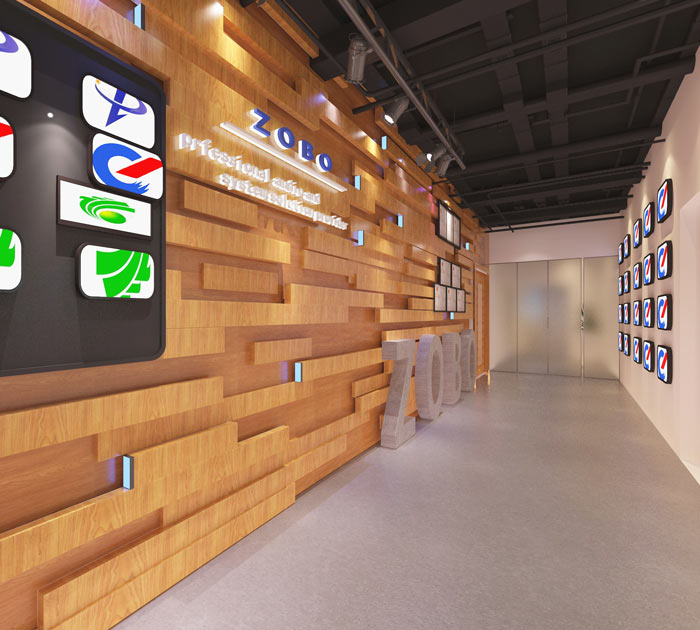 进门区域的设计:设计师在设计的时候,摒弃了前台的设立,在设计师看来此处若是设立前台只会使空间显得过于拥挤,故此设计师在考虑利弊之后最后选择放弃前台的建立,设计师采用木饰面的错落搭配来表现企业的属性,同时将企业的成功案例按照一定的规律进行展示,体现企业的实力。