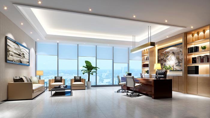 总经理办公室的设计,设计师在设计的时候,将自然光源很好的引入室内,巨大的落地窗将空间衬托的高端、大气,在衬托总经理形象的同时,又给企业企业的形象带来了很大的改观,对于企业的发展愿景有很好的帮助与推进作用。