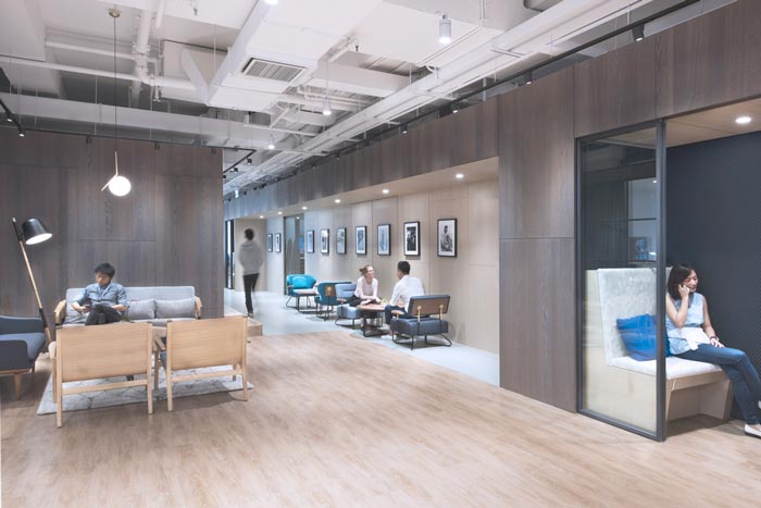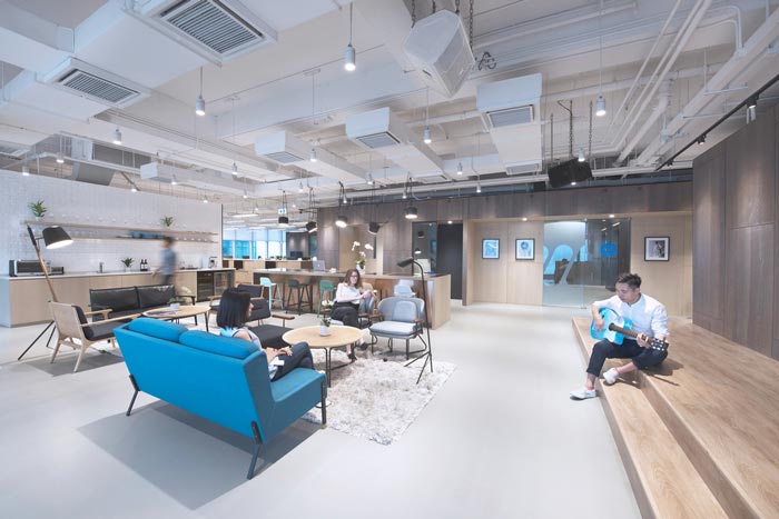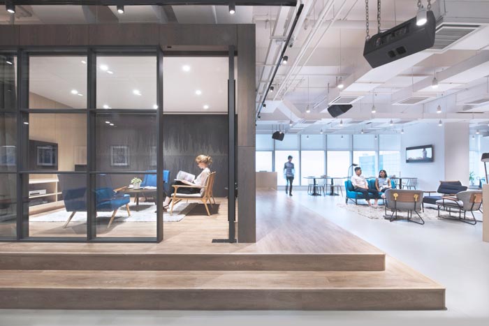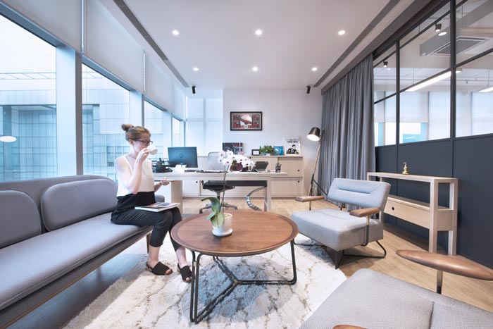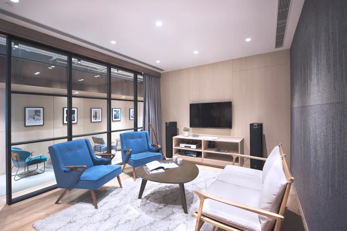 交流区域的设计:设计师在设计的时候,对交流进行了重新定义,因为在设计师看来交流的前提就是无阻力、无障碍,故此设计师在设计的时候同样采用极简的设计手法,目的就是为了打造无阻力的空间,让交流更加顺畅。