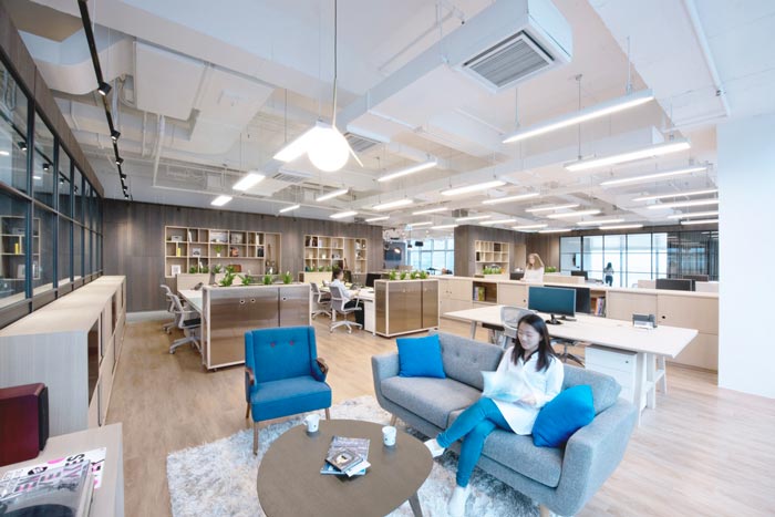 办公空间的设计:设计师在设计的时候,将办公空间与休息区域相互融合在一起,这样做的目的就是让员工可以劳逸结合,办公工位的设计也是以四人为一组,一组与一组之前以动线相隔,这样做的好处就是保证各个空间有一定的自由度,休息区域设置在窗边,让员工在此处既可以休息,也可以眺望远方取得灵感。