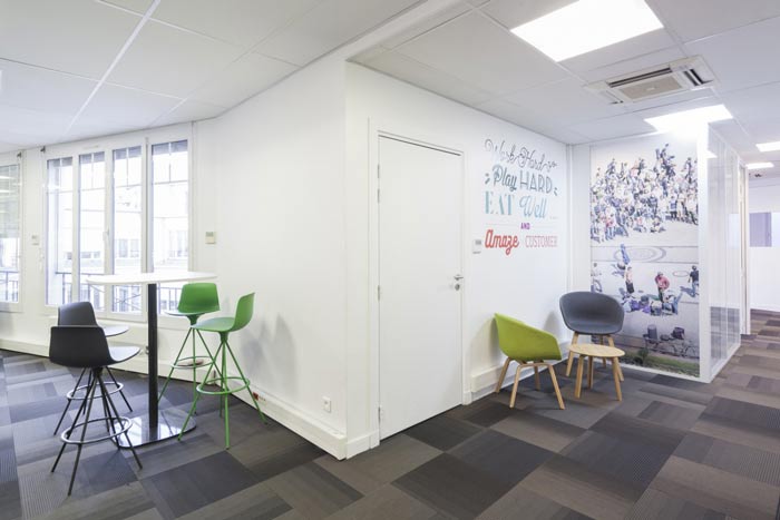 空气环保公司办公室交流区设计:此处空间本身是不规则的,所以无法将其改造成使用空间,但是设计师也不忍将其荒废,估计利用软装的便捷与其进行搭配,目的就是希望打造一个随时可以交流的空间。