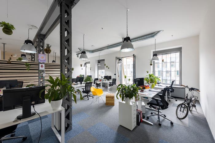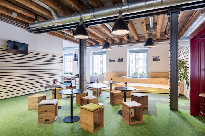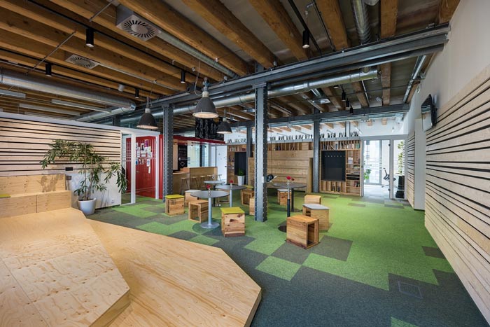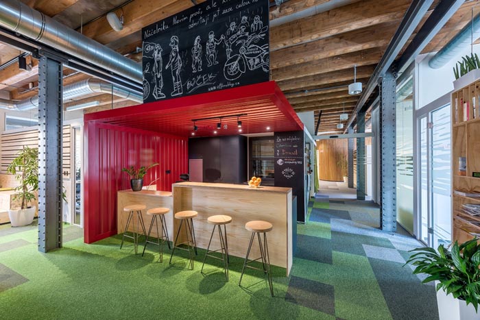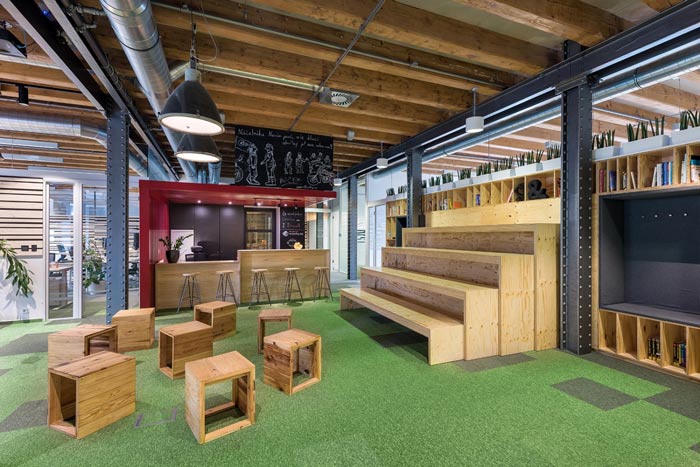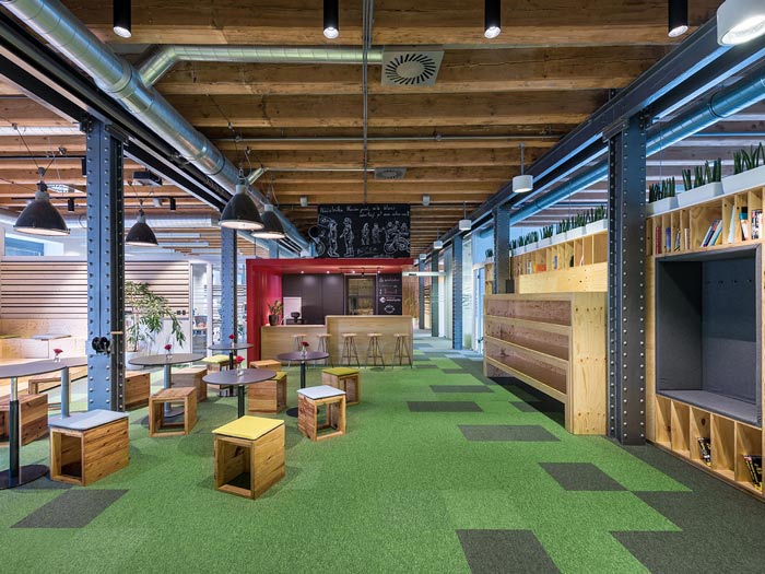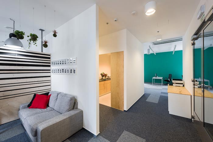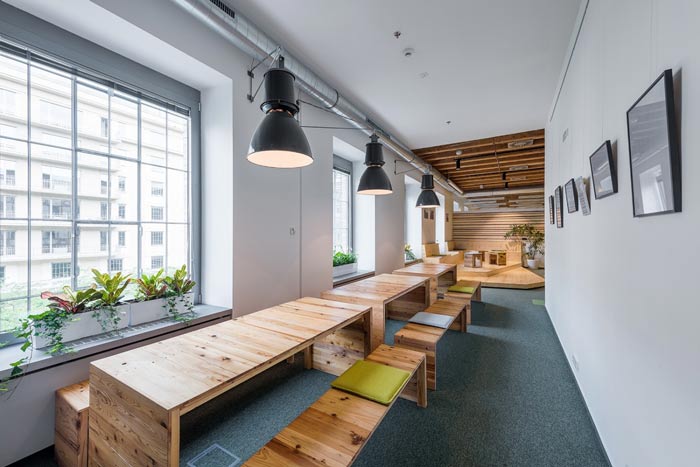 节能技术公司办公室过道设计:此处是连接办公空间与前台空间的过道设计,此处不用经过前台可以直接进入室内,同时设计师将书桌椅也做了改动,让员工可以在这里休息、看书、娱乐。