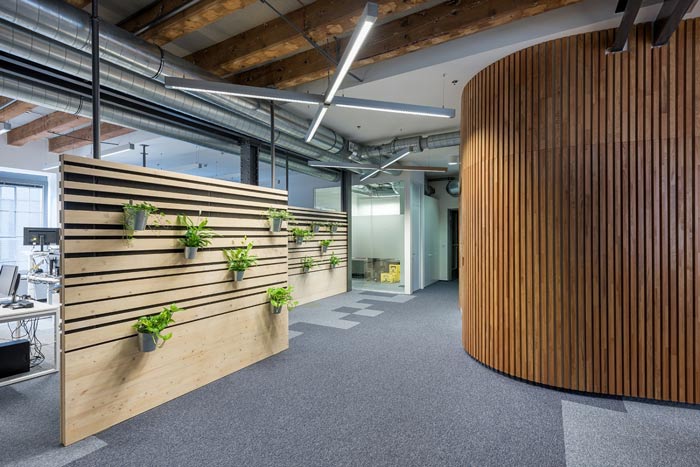 节能技术公司办公室动线设计:木制隔断是空间的一大亮点,这也是设计师根据玻璃隔断的缺点特意改进的,木质隔断不仅有玻璃隔断的优势,同时本身与整个空间也更加搭配,绿植的点缀让空间更加有活力。