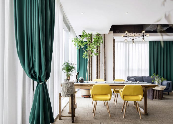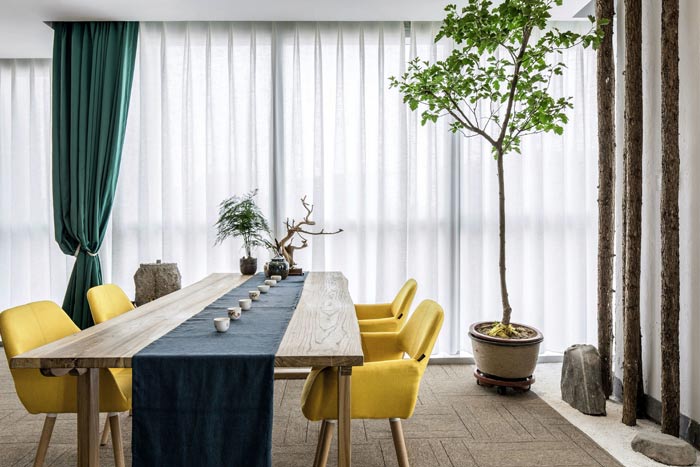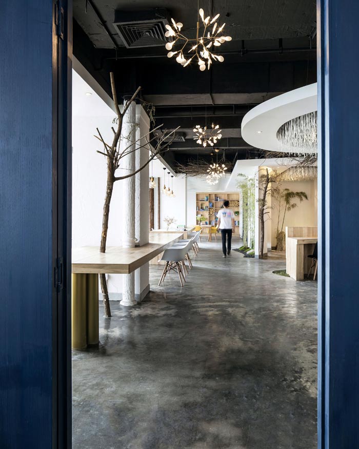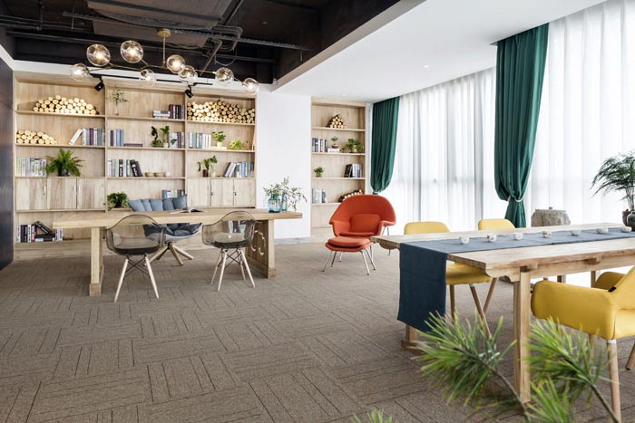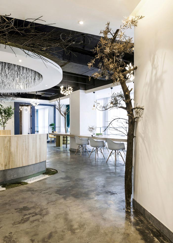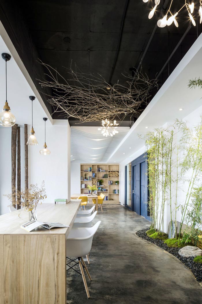 环保公司办公室左侧设计:前台位于空间的中央,往左走看到的有树木、绿竹与灯光组成的开放式办公空间,三者相互结合在一起,无形中增加了空间幽深之感,在点缀空间的同时,也加深了空间的视觉感受。