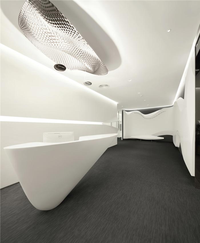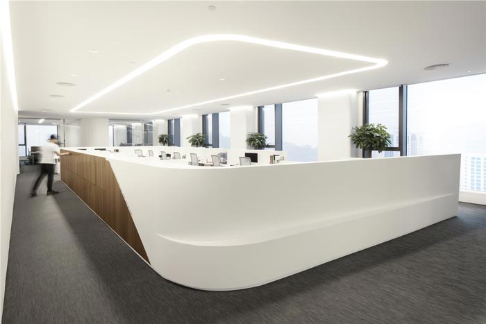 科技公司办公室前台设计:设计师在设计的时候,以一个倒三角打造前台,这样的造型很像是一个漂流的岛屿,其流线感也十分突出,给人以无限遐想,设计师利用白色主要是以白色向外的属性,以此在视觉上起到延伸空间的效果。