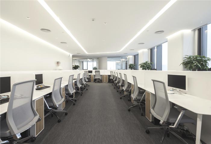科技公司办公室办公工位设计:设计师在设计的时候,将办公工位采用椭圆回形设计,以开放式办公为七点,以回形设计将边缘空间充分利用,一方面可以保证开放式办公的形成,另一方面回形设计可以加强员工之前的交流,保证内外相互连接、相互独立。