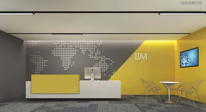 科技公司办公室前台设计:设计师在设计的时候,使用了黄色、灰色、白色三色相互结合的设计手法,设计师希望通过色彩之间的相互转换,黄会之间的色变将空间的简洁之风推至顶峰,灰色的沉着与冷静来表达企业对于产品的精益求精。
