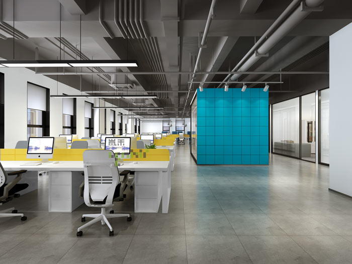 科技公司办公室办公区设计:设计师为了在办公区开辟出一个交流区,故此将空间按照5:5的比例对空间进行划分,设计师将交流区设置成独立空间,以动线将空间加以划分,做到分合有序。