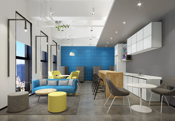 科技公司办公室茶水吧设计:设计师在满足茶水间原有需求之后,将休息区融入到空间之中,在设计师看来茶水间与休息区域相结合,为员工带来休息、娱乐的氛围,让员工在这里放松身心。
