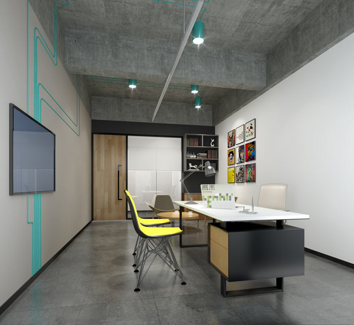 科技公司主管办公室设计:此处是一个长方形的空间,设计师为了调和空间的视觉感受,故此在空间的基础上进行延伸与深化,居中的办公桌为空间增添了无限活力,展现了少的魅力。