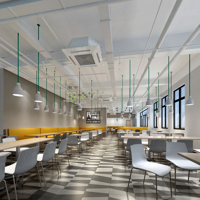 科技公司办公室餐厅设计:企业有自己的餐厅,这里是员工集聚的场所,故此设计一定要考虑到实用性,简洁、明亮的空间让大家在这里安心就餐,同时相互交流、彼此攀谈。