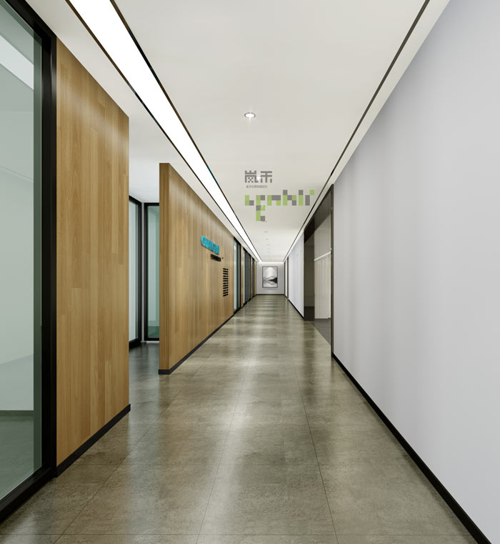 科技公司办公室走廊设计:木隔断将空间隔离成一个个空间,黑色的踢脚线使隔断进一步得以优化,隔离与界限表示了设计师分与合的设计理念,设计师希望让一切变的顺畅、便捷。