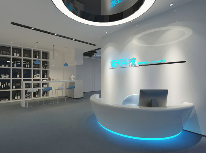 科技公司办公室前台设计:设计师在设计的时候,采用弧形的设计手法对空间进行设计,在设计师看来弧形自身就拥有科技的属性,同时弧形自身圆润的弧线,也让空间的质量感提升,极简的设计手法对于企业品牌的展示起到聚焦的作用。