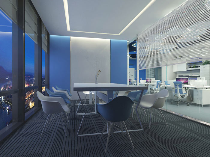 科技公司办公室会议室设计:设计师在设计的时候,将空间利用隔断与外界空间进行分离,为企业打造一个独立与空间之外的空间,以此保证空间的安静与宁静,空间的另一边可以很好的俯视城市的风景开拓视野。