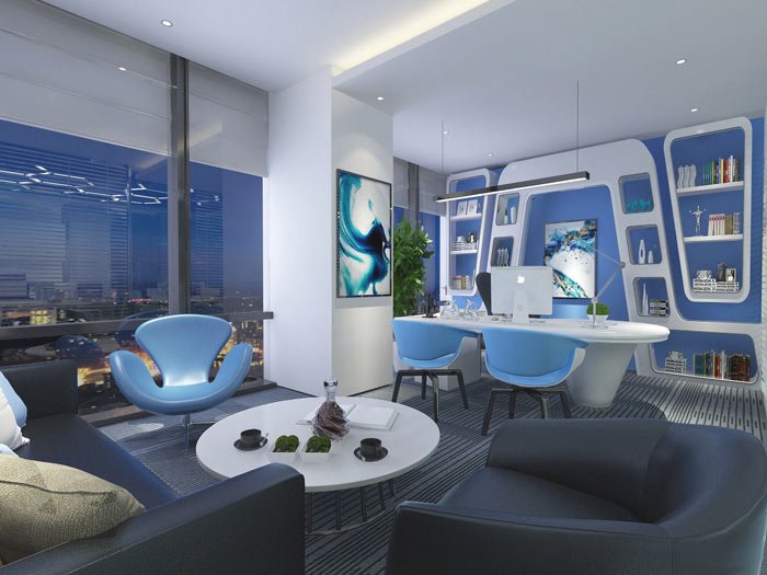 科技公司总经理办公室设计:设计师在设计的时候,按照见缝插针、置身事外的设计手法对空间进行设计,设计师希望通过将工作、生活、知识融合在空间中,为总经理本人的提升制造一个优质的平台。
