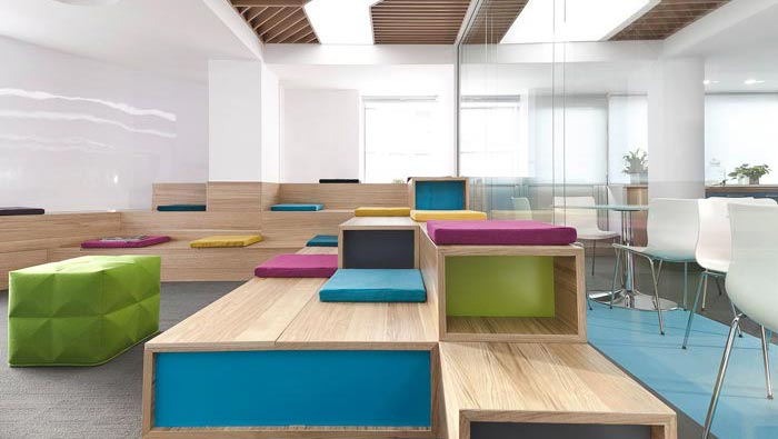 网络公司办公室阅读区设计:设计师在设计的时候,采用递进式的设计手法对空间进行设计,设计师希望让每一个人都各安其位,各自研究自己擅长的知识不受打扰,同时又相互连接,可以相互交流、互惠互利。
