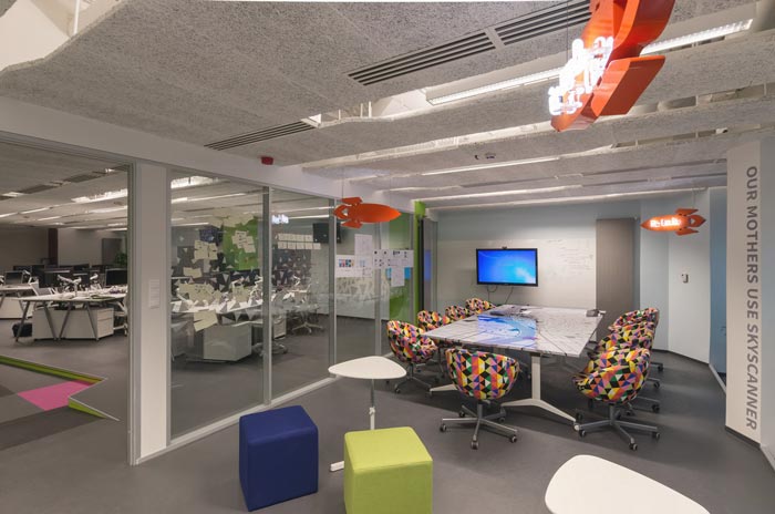 旅游门户办公室培训区设计:此处的培训区域不只是针对企业内部,同时也是针对客户旅行前的培训,设计师在设计的时候,重点考虑的问题就是,如何在有限的空间之中,将容纳扩大化。