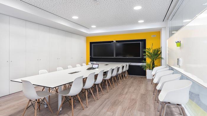 会网络游戏公司议室设计:设计师在设计的时候,考虑到企业的属性,故此在设计中设计师将液晶屏并列在一起,以此展示不同的画面与内容,为会议的顺利开展增加便利,同时在会议室的旁边设置了旁坐区,座椅排列的方式也很有讲究,不会让坐者感受到被边缘化。